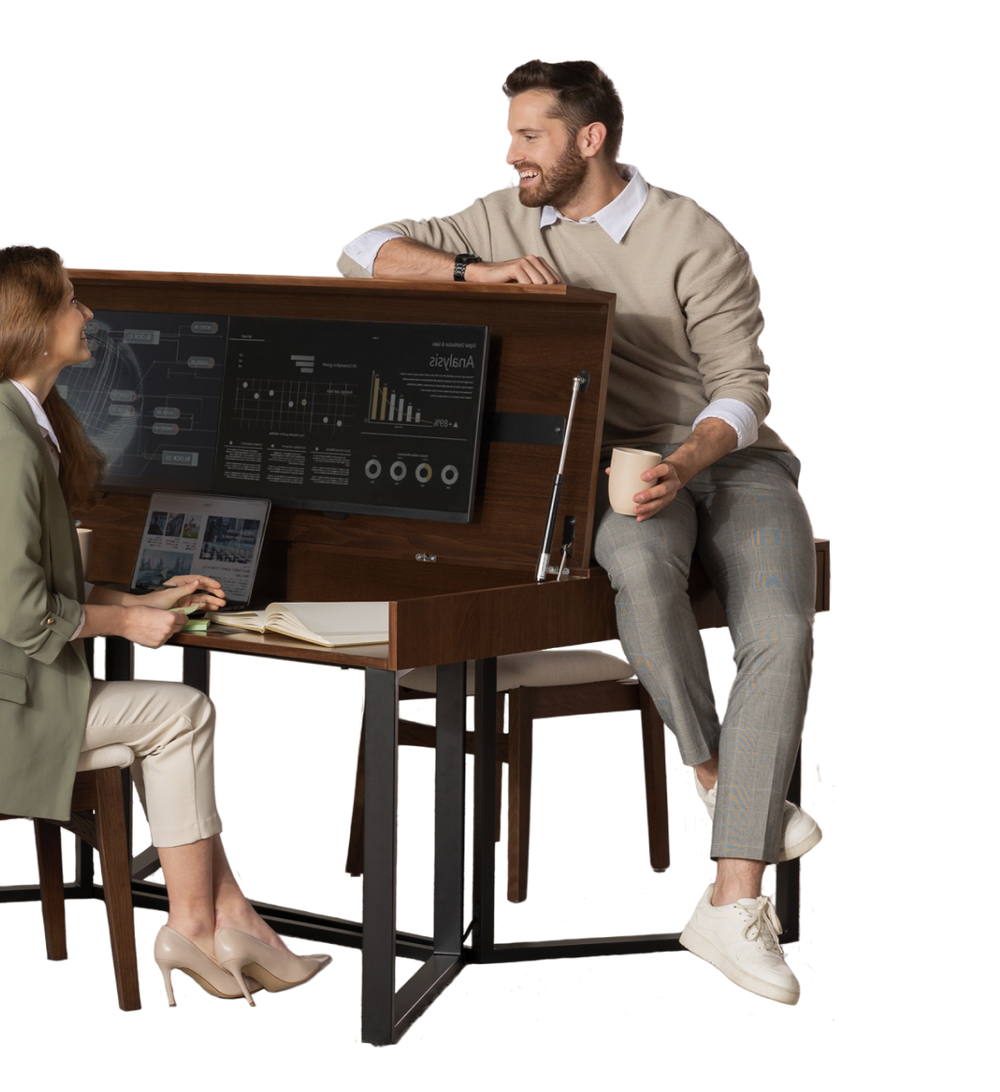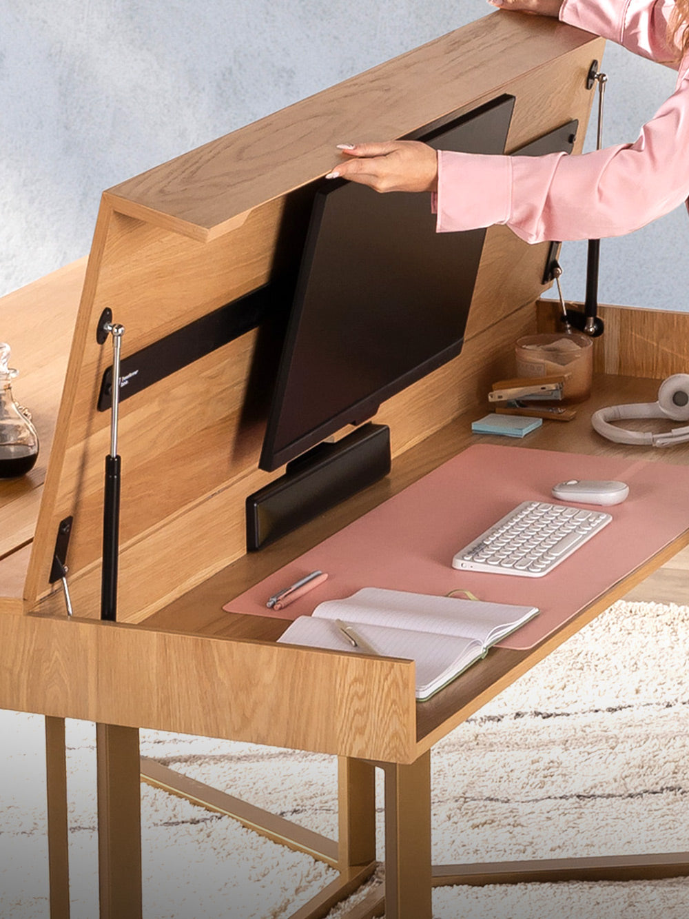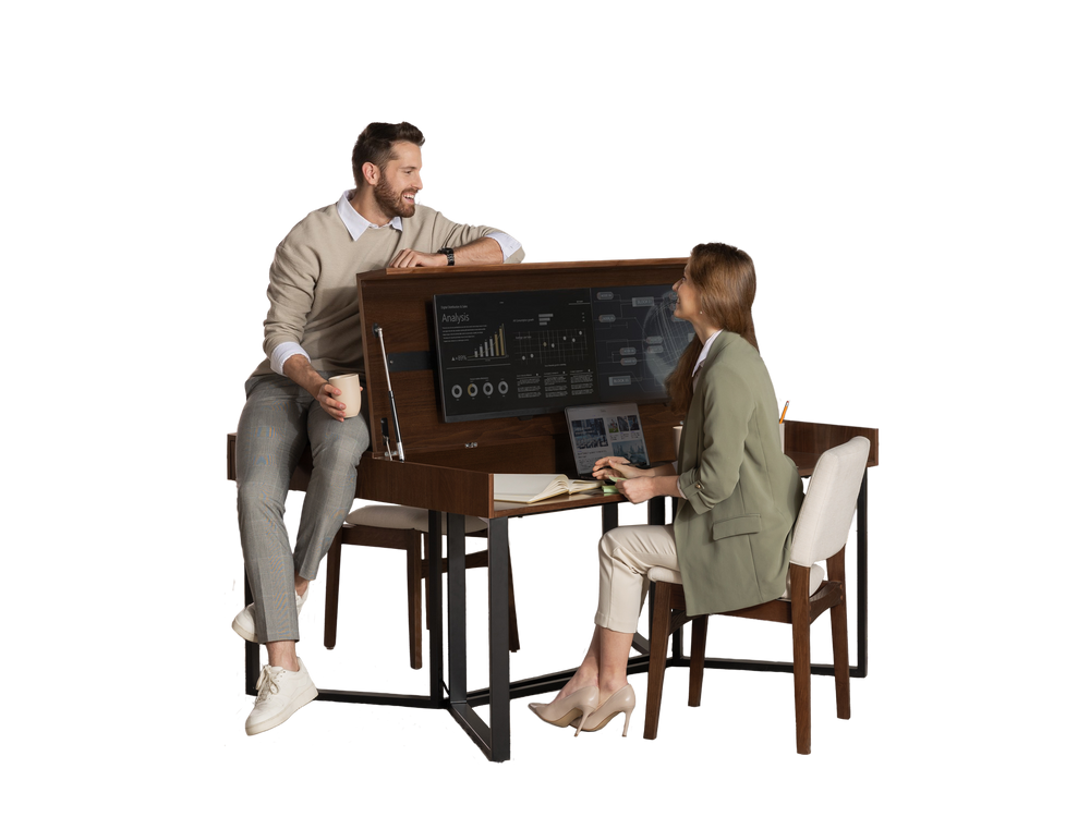 Passez sans effort de 9h à 17h de 17h à 21h avec la table à manger qui se transforme en deux bureaux. Équipée de rangements intégrés et de gestion des câbles pour que le travail à domicile ne perturbe pas la vie à la maison.