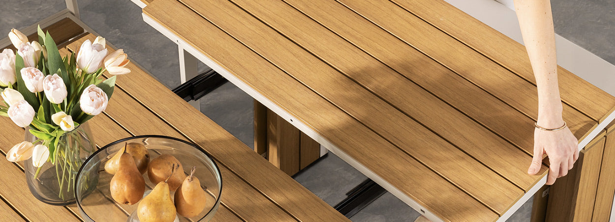 La seule table de patio extensible au monde. Un ensemble de salle à manger extérieur 6-en-1 qui s'étend jusqu'à plus de 9 pieds de long. Résistante aux intempéries et conçue pour un rangement facile, la vie en extérieur n'a jamais été aussi simple.