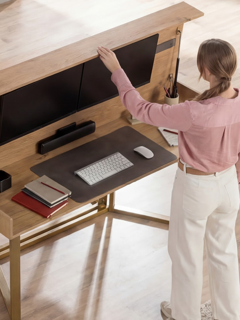 Un bureau à domicile qui se transforme facilement en table à manger. Rangements intégrés et gestion des câbles pour un télétravail discret au quotidien.