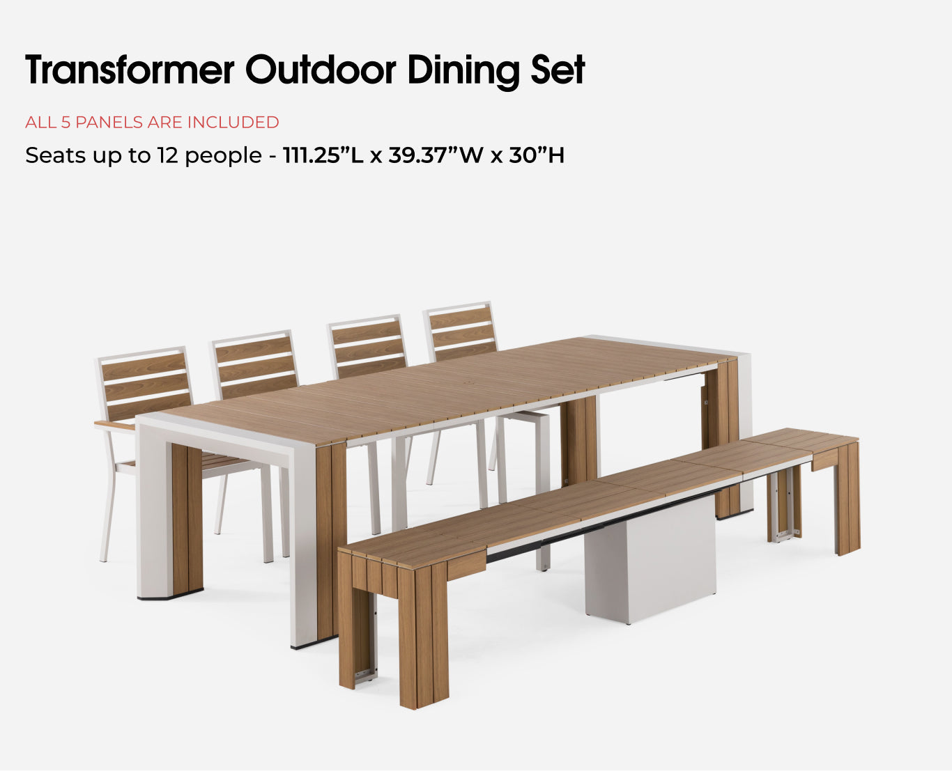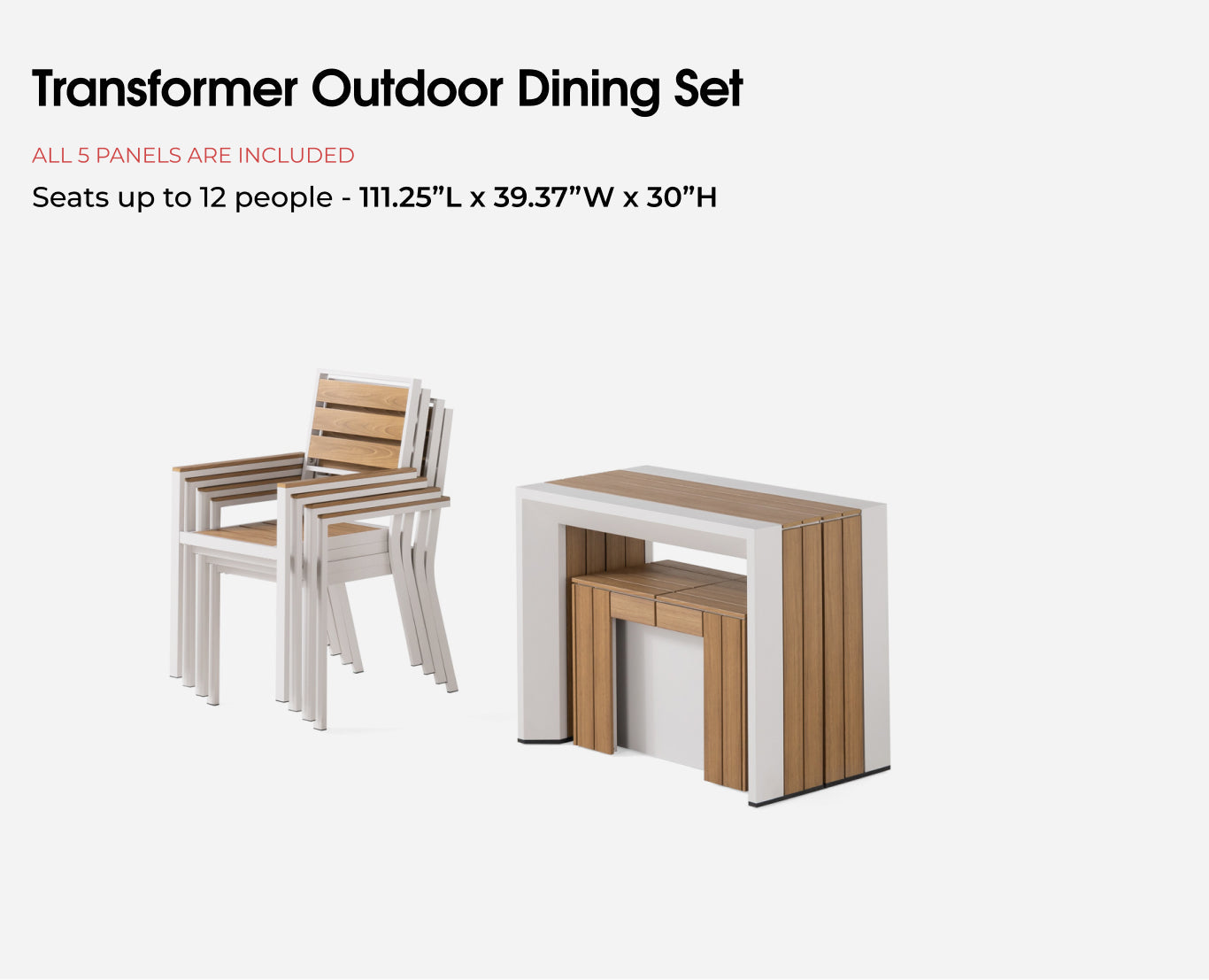 La table d'extérieur Transformer supporte jusqu'à 750 lb et chaque chaise d'extérieur Transformer peut supporter jusqu'à 400 lb.